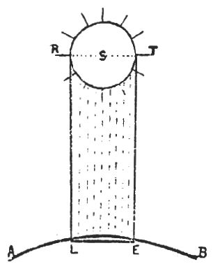 In northern latitudes the shadows fall towards the north; and in the southern, towards the south. The declination of the sun varies from the tropic of Cancer, 23.5 degrees N., to an equal declination south of the equator, the tropic of Capricorn. Between these extremes the sun is always at noon, directly overhead in places with the altitudes equal to his declination. The variation in which is the cause of the varying seasons. In these places on land, or at sea, the sun casts no side shadow at noon; and it has been found that this phenomenon extends for 32 miles. So that the column of the sun’s vertical rays is 32 miles across in every direction – a distance equal to the length of the solar diameter! And, whether we take the surface of the sea as curved or horizontal, there would make little difference, as may be seen in the diagram above.