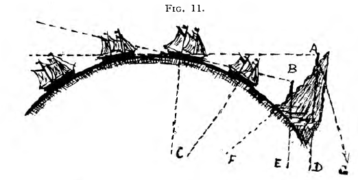 Now let us apply these rules, which are the Laws of true Perspective, to the disappearance of ships at sea, as illustrated in zetetic diagrams, and validate in those of the globularist. First take Fig. 10 on the title page of Part II. The intelligent reader will soon see that this zetetic diagram harmonises with, and illustrates, the first six rules above given. The hull of the vessel, being nearer the eye-line, vanishes according to rule 6, before the flags and upper sails, which are farther from it, because the lower angle is the lesser. Besides, the hull rides on a dark background of water, while the upper masts and sails are often against a bright sky! But the ship never goes over, and then down on the further side of a bulge, or a hill of water; for in clear weather a good telescope, which magnifies the distant angle of vision, brings again the ship’s hull in sight. Had the ship gone over and beyond the supposed dip, or curvature, no telescope could fetch it back again; and when the crest of the supposed hill of water the hull itself should become visible against the background of a clear sky! But in harmony with rule 4, ships never so disappear, because there is no real rise or protuberance in calm sea, which, as we have abundantly shewn is everywhere level or horizontal.