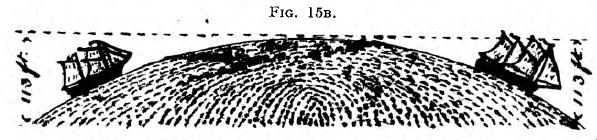 The above figure 15B illustrates the supposed curvature when, as is often the case in clear weather, a great extent of sea surface is visible looking in opposite directions, say 25 miles each way. This should give a dip of 420 feet on each side. If the sea were globular, the curvature of its surface ought to be plainly visible, especially from a balloon, for a sweep of 50 miles, looking both ways; but no such curvature has ever been seen, even for longer stretches, but only one vast and uniform level, rising perspectively to the eye-line. See figure 15B and compare it with any good sea-scape. Fig. 15A shews what ought to be seen from a balloon (E) if the sea were globular.