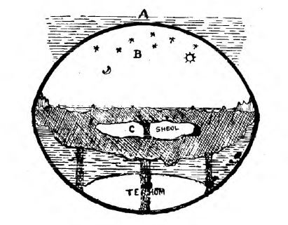 A— the first heaven, where God’s throne is, with waters above the firmament. B— the Firmament, or second heaven, a strong structure supporting the waters above it. (Job xxxvii. 18). C— the roof of the Unseen (Hades) or Under-World, forming the third heaven, where Paradise is at present concealed awaiting our Lord’s return. (Compare Luke xxiii. 42, 43. with Matt. xii. 40). Tehom, the abyss. (Isa. Ixi. I ; I. Pet. iii. 19 ; Jude vi. ; and Rev. ix. 11 and xx. 1-3)