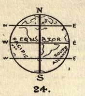 As the two observers are on the same meridian they use the same north and south, while all lines which cross that meridian at right angles indicate east and west, and are parallel to each other; so that A’s east is parallel to B’s, and to the equator, as in diagram 24.