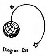 When stated even more plainly it means that when we think we see a star overhead we are mistaken, for that is merely the end of a ray of light coming to us from a star which— in the material body— may be millions of miles to the right of us, or it might even be behind us; as in diagram 26.