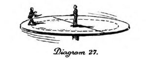 He says that because the disk is in motion, the small measuring rod will appear to the observer (at the centre) to be contracted, so that the person who is measuring (whom I will call “B” ) will have to apply the rod more often to go round that circle than he would if the disk was at rest. That is not true ! . . . If B actually lays the rod (or foot rule) down upon the disk correctly, the number of applications to go round the circle will be the same whether the disk is moving or not, and the observer at the centre will see that it is so, if he is not made too dizzy to count. On the other hand, if B does not lay the rod down and measure the circle as one would expect, but only walks around the disk with the rod in the air (as in diagram 27) then the rotation of the disk will disturb him, so that he has to make an effort to preserve his balance; with the result that he can not place the rod as accurately as he would if the disk were not in motion; and in that case it may take either more or less applications of the rule to go completely round than it would if the disk were still; and that difference would be seen by the observer at the centre— not as an optical illusion! (as Einstein implies) but in reality; a result that is entirely physical, and due to physical causes. When walking across the disk and measuring the diameter, B is not disturbed to anything like the same degree as in walking round the circumference, and so he measures the diameter more accurately. Most of us have at some time or other witnessed the antics of a clown trying to run or walk upon a spinning disk in a circus, and this enables us to understand how such a motion would affect our friends performing on Einstein’s revolving table.