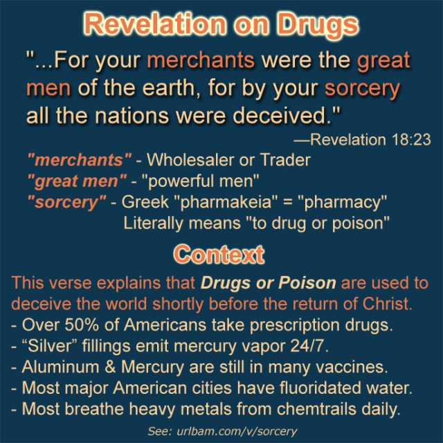 The word “sorcery” in this passage is the Greek word “pharmakeia” (Strongs #5331) (far-mak-i’-ah). This is the source of the English word “pharmaceutical”. The true meaning if the word pharmakeia is “to drug or poison”, so here we see the chemical dumbing down of the world by drugging and poisoning. This is to occur shortly before the return of Christ to Earth. This modern chemical-dumbing-down of the population was predicted in the Bible thousands of years ago.