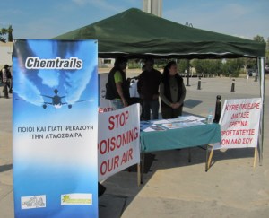 Caroline and her partner, along with other friends, Jayne and my self supported a group who had a stand in Paphos Harbour that told the people about the spraying of our skies. This brought the local TV and newspaper media there. When the cameramen were there, I said to them, “If you don’t believe in chemtrails, then look up at the sky!” The camera swung around to record live the spraying. The timing couldn’t have been better. The reporter couldn’t say a word but he couldn’t deny it, either.