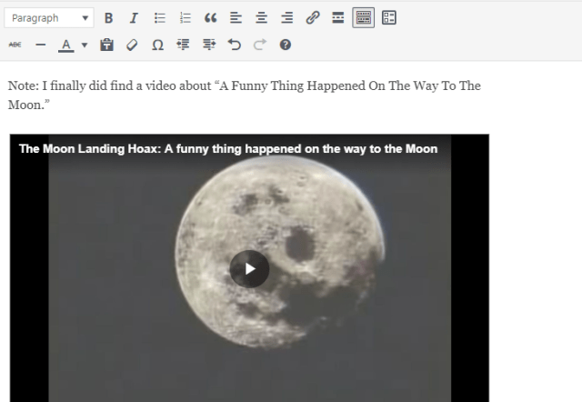 As I was posting this article I had two videos that I embedded, as I’ve done many times before. Then I published it. When I went to the live page I did not see my videos there! So, I did it again, thinking that I made a mistake, and sure enough, my videos did not show up. This prove that the Satanic powers do not want the truth out. I’m sure they know that people like me would be posting something about the fake Moon landing as it’s the big 50th anniversary.
