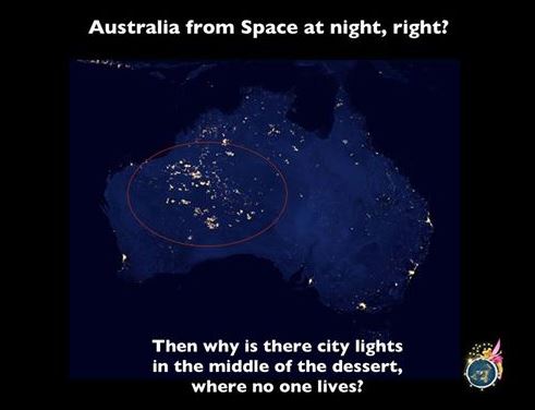 Here is a picture of Australia from ‘space’ and it shows city lights in the dessert! What really happened is someone who doctored the pictures didn’t realise that this section of Australia has no cities or towns of any size.